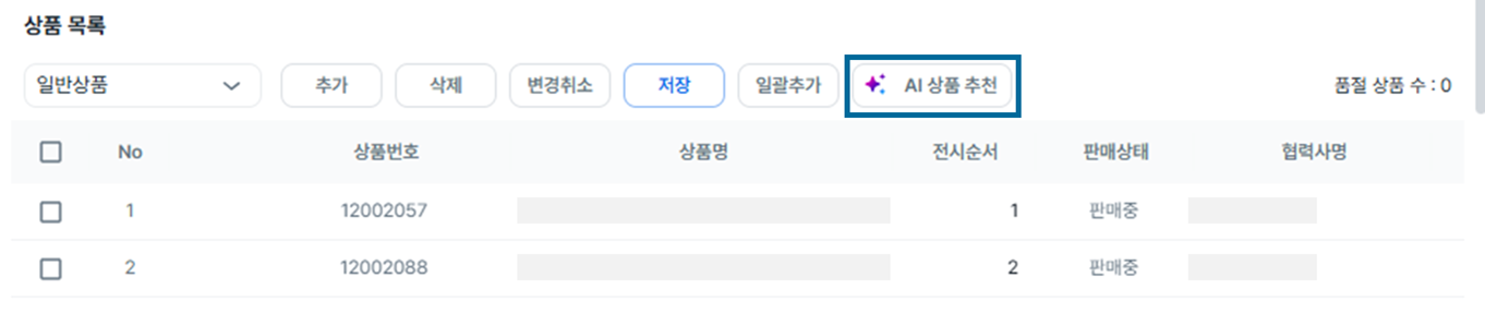 기획전에 추천될 상품의 조건을 선택 및 입력 후 AI 생성을 클릭하면 상품구성, 유형, 상품번호, 상품명, 추천사유, 판매상태, 판매방식, 브랜드, 협력사까지 의사결정에 필요한 정보를 제공합니다.