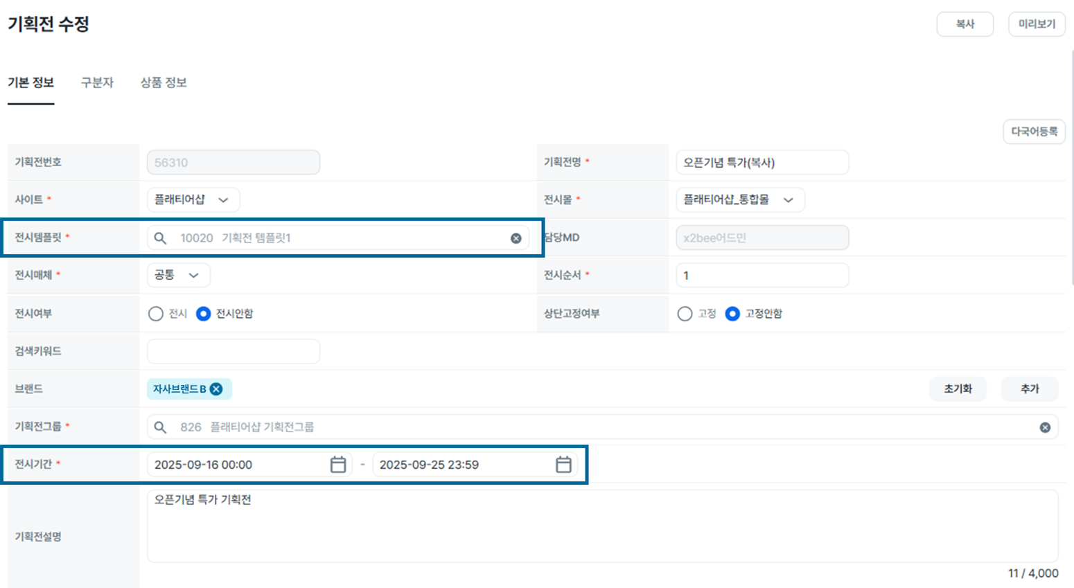 뿐만 아니라, 전시기간, 헤드 이미지 등 구성 요소를 백오피스에서 담당자가 직접 수정할 수 있어 민첩한 기획전 운영이 가능하죠.