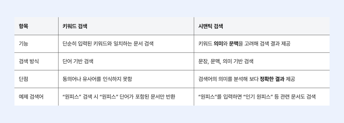 기존의 키워드 매칭 방식이 아닌 의미 기반 검색을 구현하는 기술로 문장을 벡터 형태로 변환하여 더 유사한 검색 결과를 제공