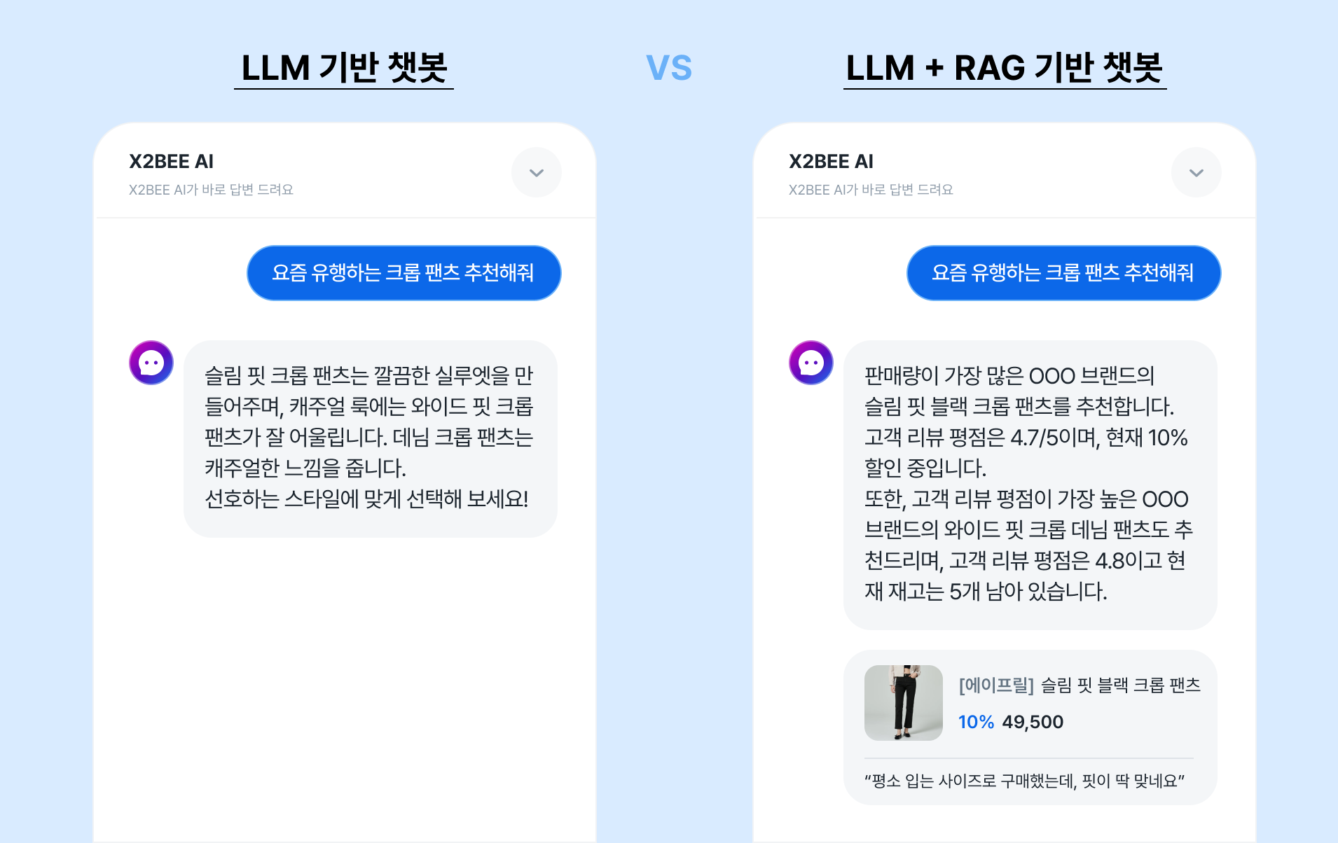 <LLM 기반 챗봇 VS. LLM+RAG 기반 챗봇>