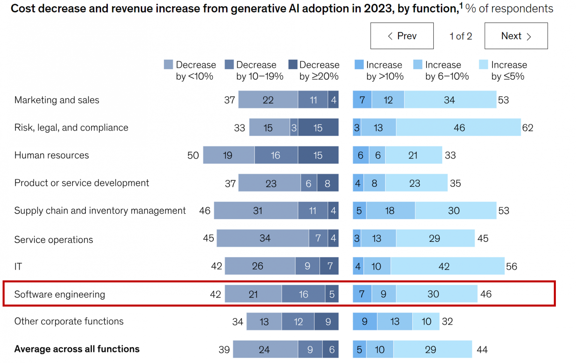 맥킨지의 최근 연구에 따르면 소프트웨어 엔지니어링 분야의 경우, 생성형 AI를 도입했을 때 응답자의 42%가 비용 절감을, 46%가 매출 증가를 경험했다는 결과가 나타났습니다.
