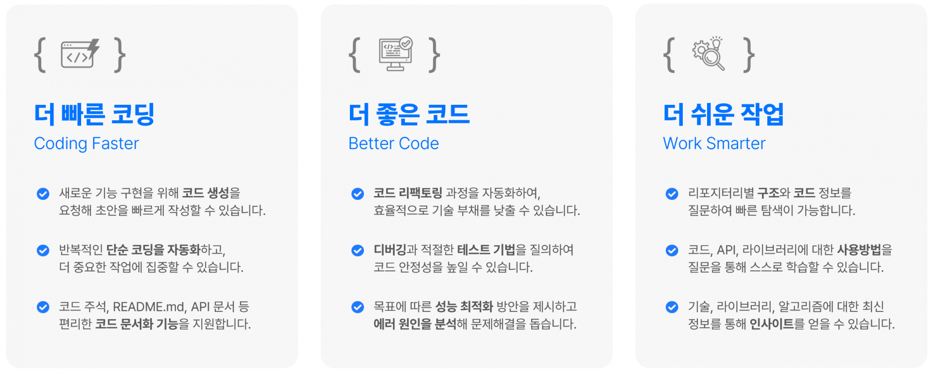 프로젝트 구조와 기존 코드에 대해 대화형으로 질의응답이 가능해 맥락 기반 이해를 돕고, 코드 생성과 리팩토링, 보안 취약점 분석, 유닛 테스트 지원 기능을 제공합니다. 또한, 코드 주석 작성, API 문서화, README 업데이트 등 반복 업무를 자동화해 개발 워크플로우의 효율을 높입니다.