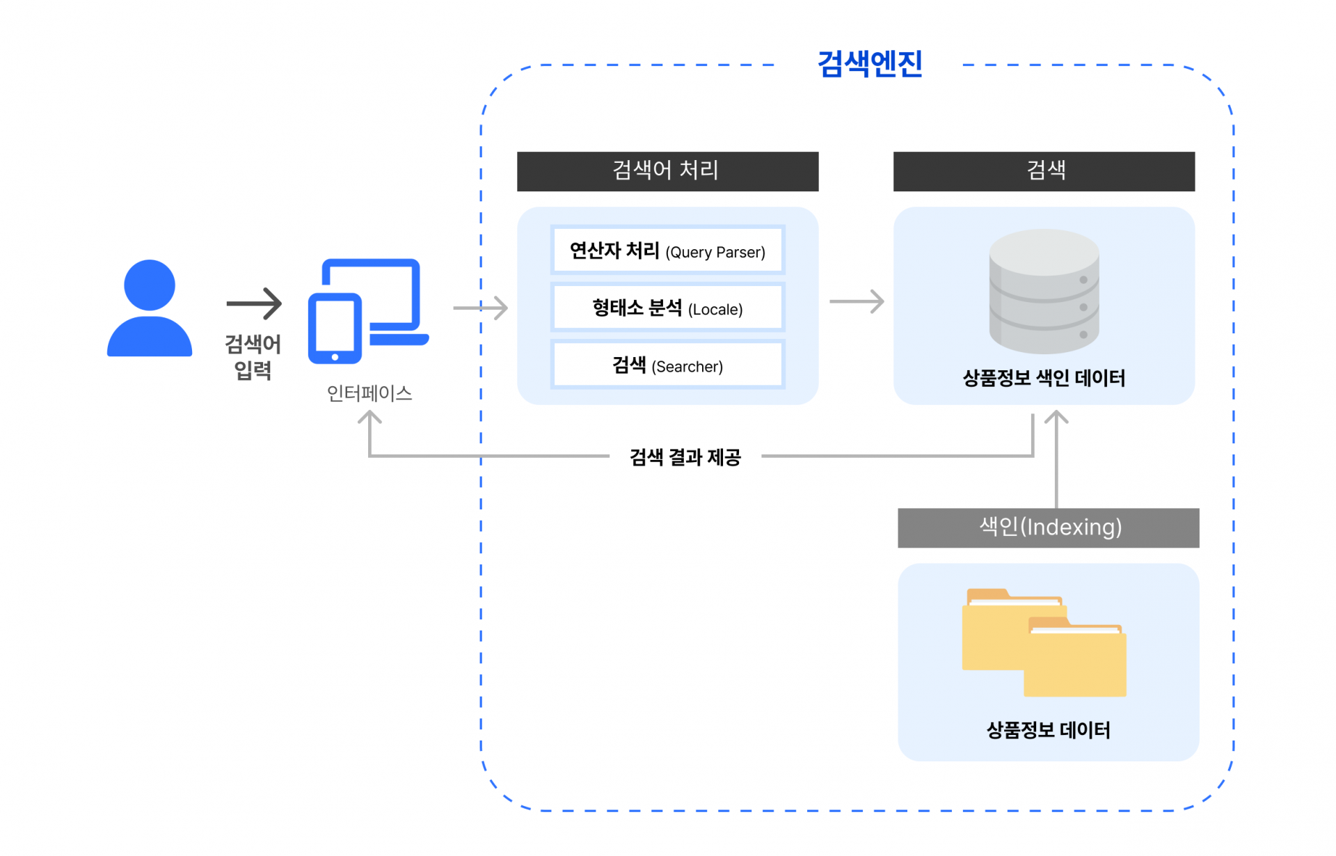 이커머스 검색 프로세스는 크게 ‘검색(Search)’ 영역과 ‘색인(Indexing)’ 영역으로 구분됩니다.