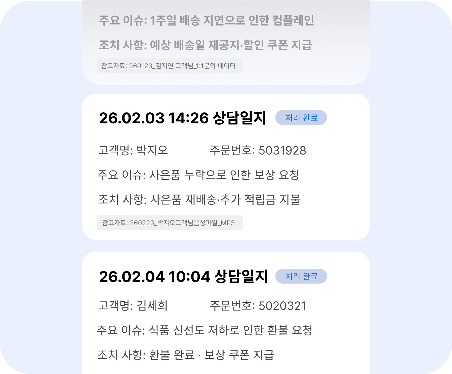 주요 이슈와 조치 내용을 중심으로 상담 내용을 자동으로 요약하여