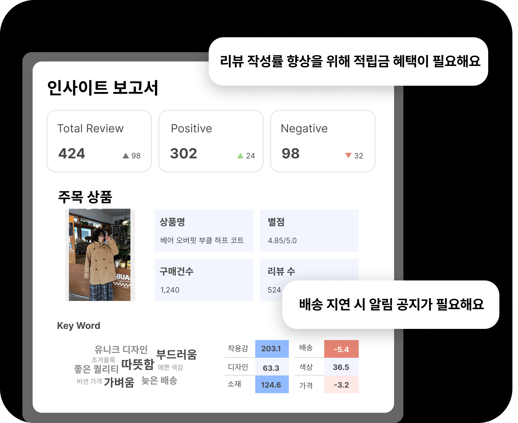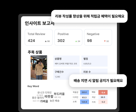리뷰 분석 기반 인사이트를 리포트로 자동 생성해 판단을 더 빠르고 명확하게 내릴 수 있습니다