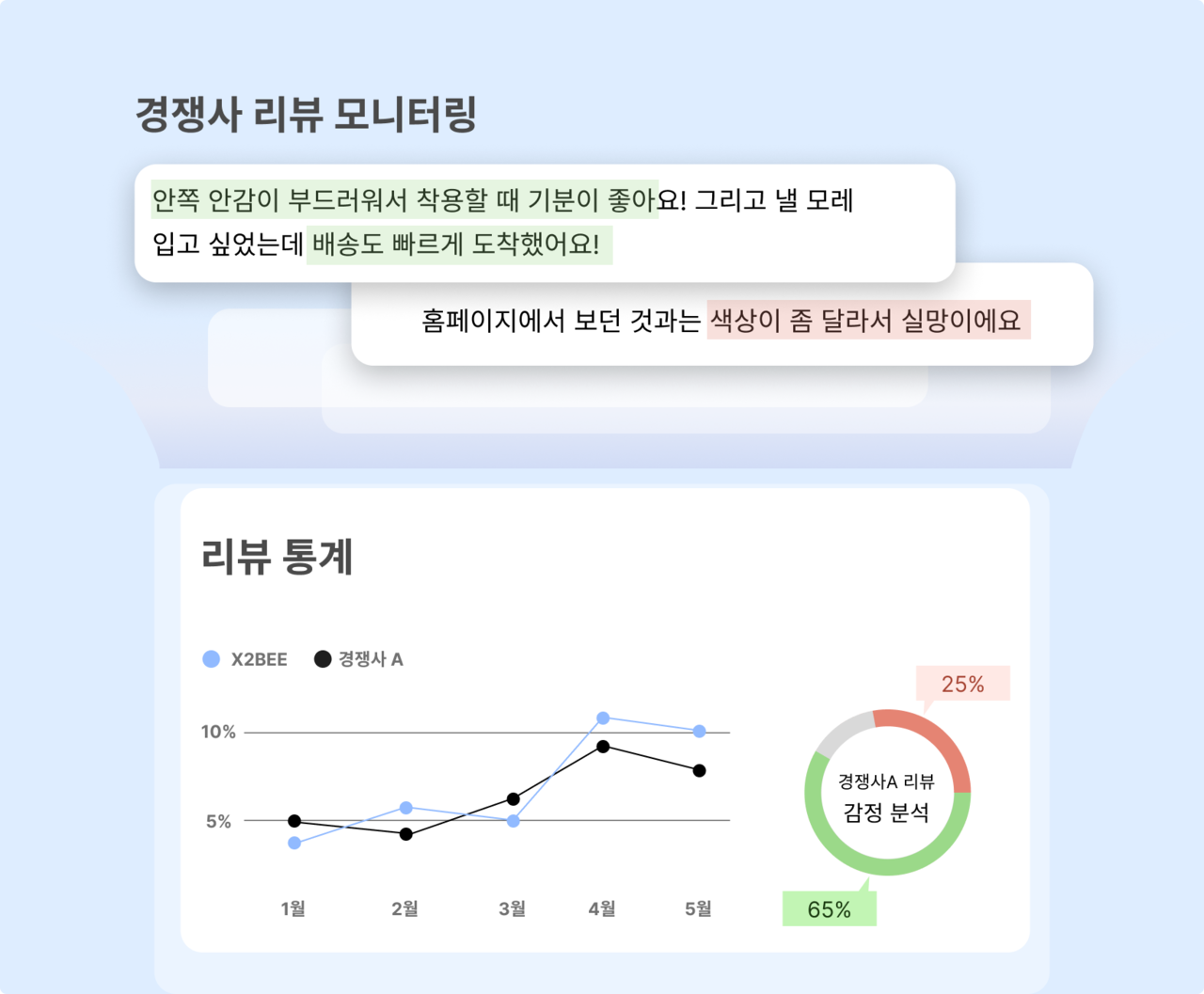 경쟁사 리뷰를 함께 분석해 자사 제품의 강점 및 개선 포인트를 객관적으로 도출할 수 있습니다