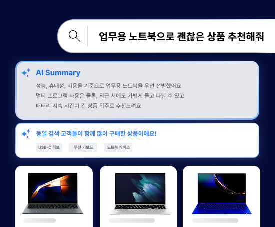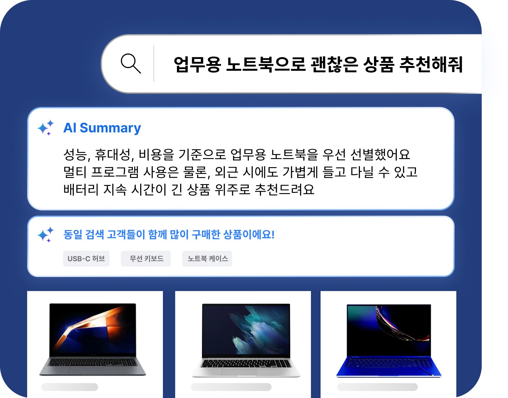 구매 결정 가속화검색 결과를 AI가 요약하고 연관 상품까지 함께 제안해 비교·고민 시간을 줄이고 선택을 앞당깁니다
