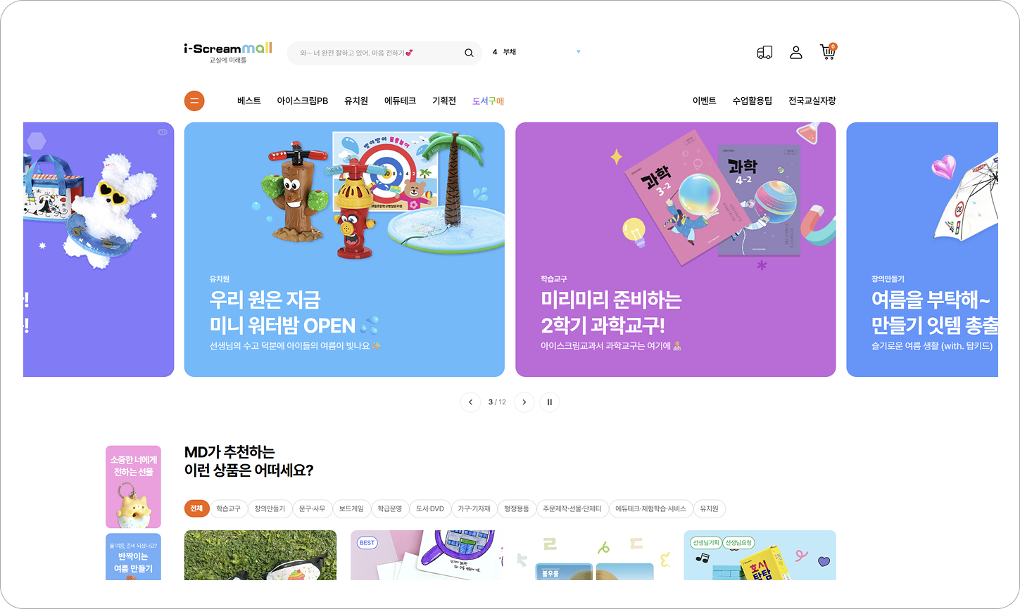 아이스크림미디어는 교육 전문 온라인 플랫폼인 '아이스크림몰'과 학교 생활에 필요한 다양한 상품을 제공하는 '하이스토어'를 운영하며, 유-초-중등 교육 현장의 디지털화를 선도하는 에듀테크 기업입니다.